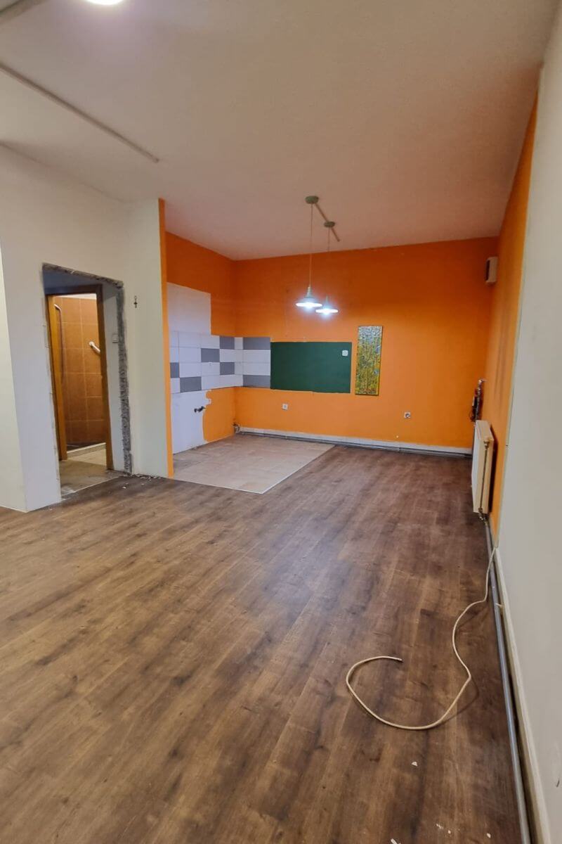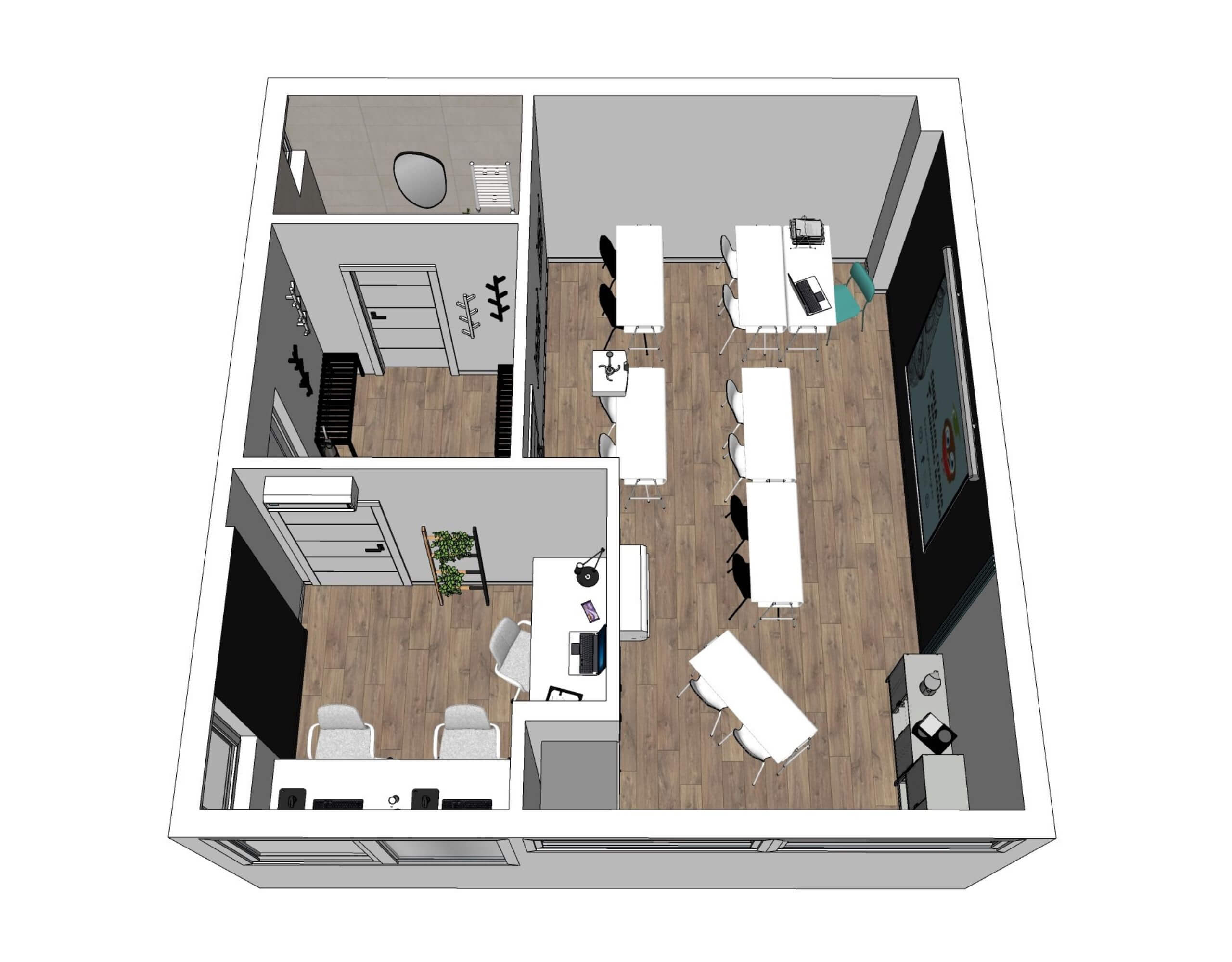 Zadatak je bio napraviti idejno rješenje poslovnog prostora uključujući podne i zidne obloge te sanitarije te predložiti raspored i dispoziciju namještaja te na malom prostoru osmisliti kvalitetan prostor za učionicu, čekaonicu, kupaonicu te zaseban ured. Također, naš studio je pripremio izvedbeno rješenje s detaljnim troškovnikom svih radova i opreme te je u suradnji s vanjskim izvođačima nadgledao i odradio kompletan projekt radova i opremanja ovog poslovnog prostora.