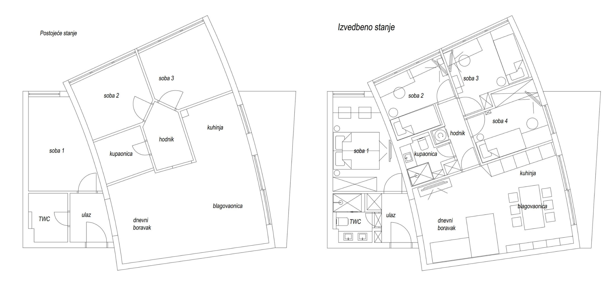 Pokazujemo vam tlocrt izvedbenog stanja stana koji je išao u kompletnu adaptaciju, a na slici pored možete vidjeti koji je bio tlocrt postojećeg stanja.