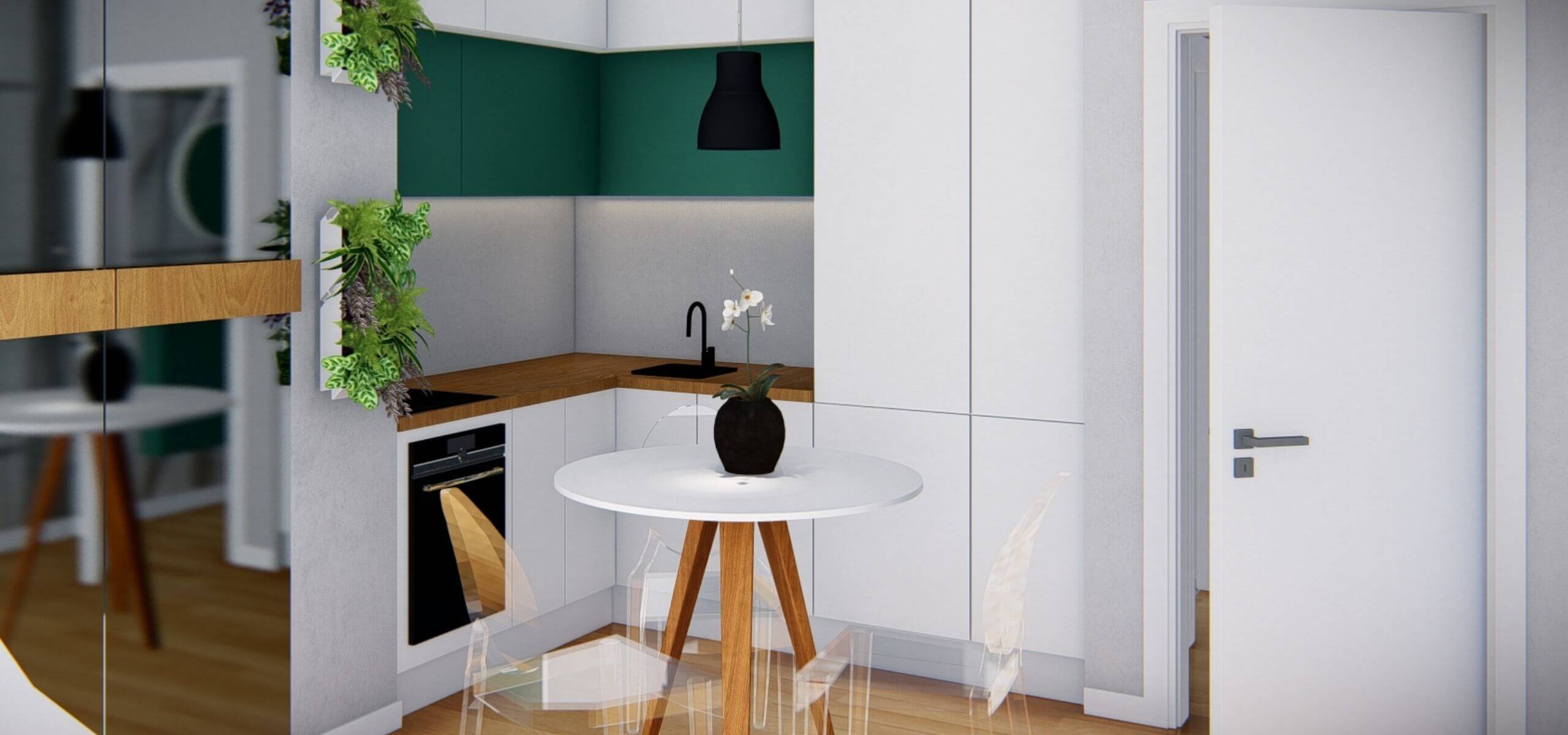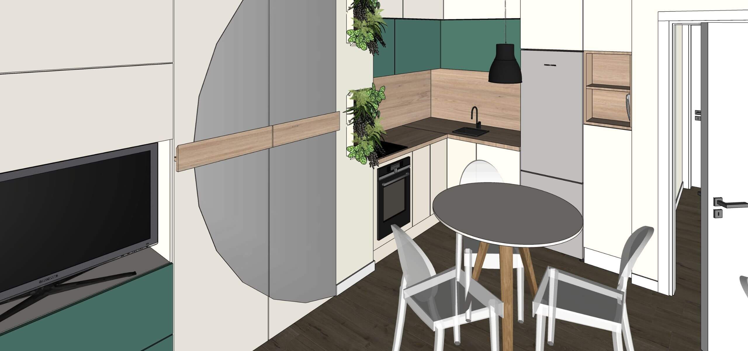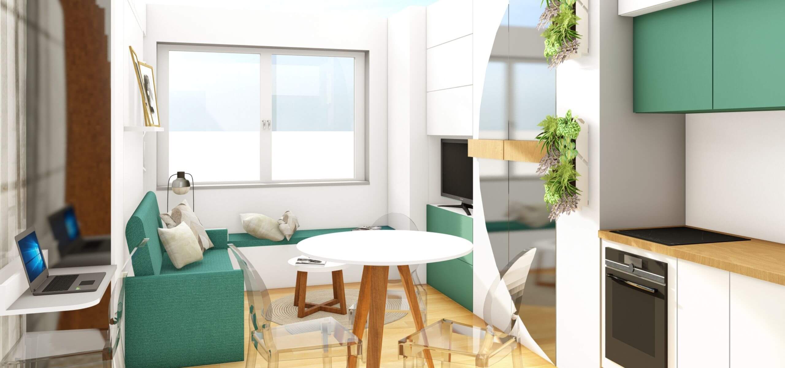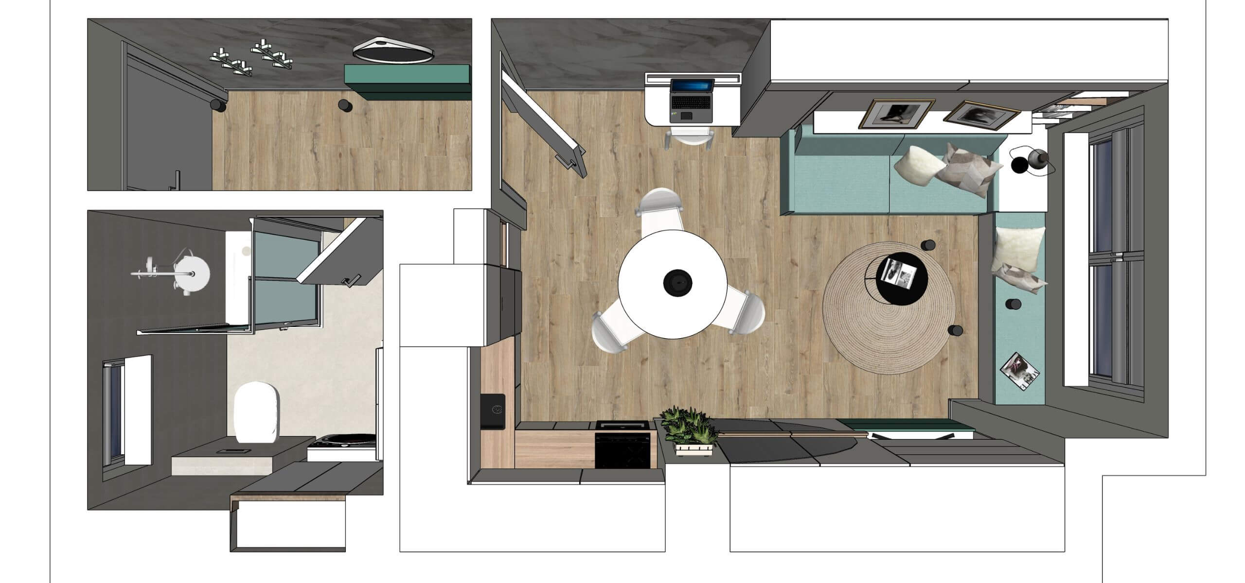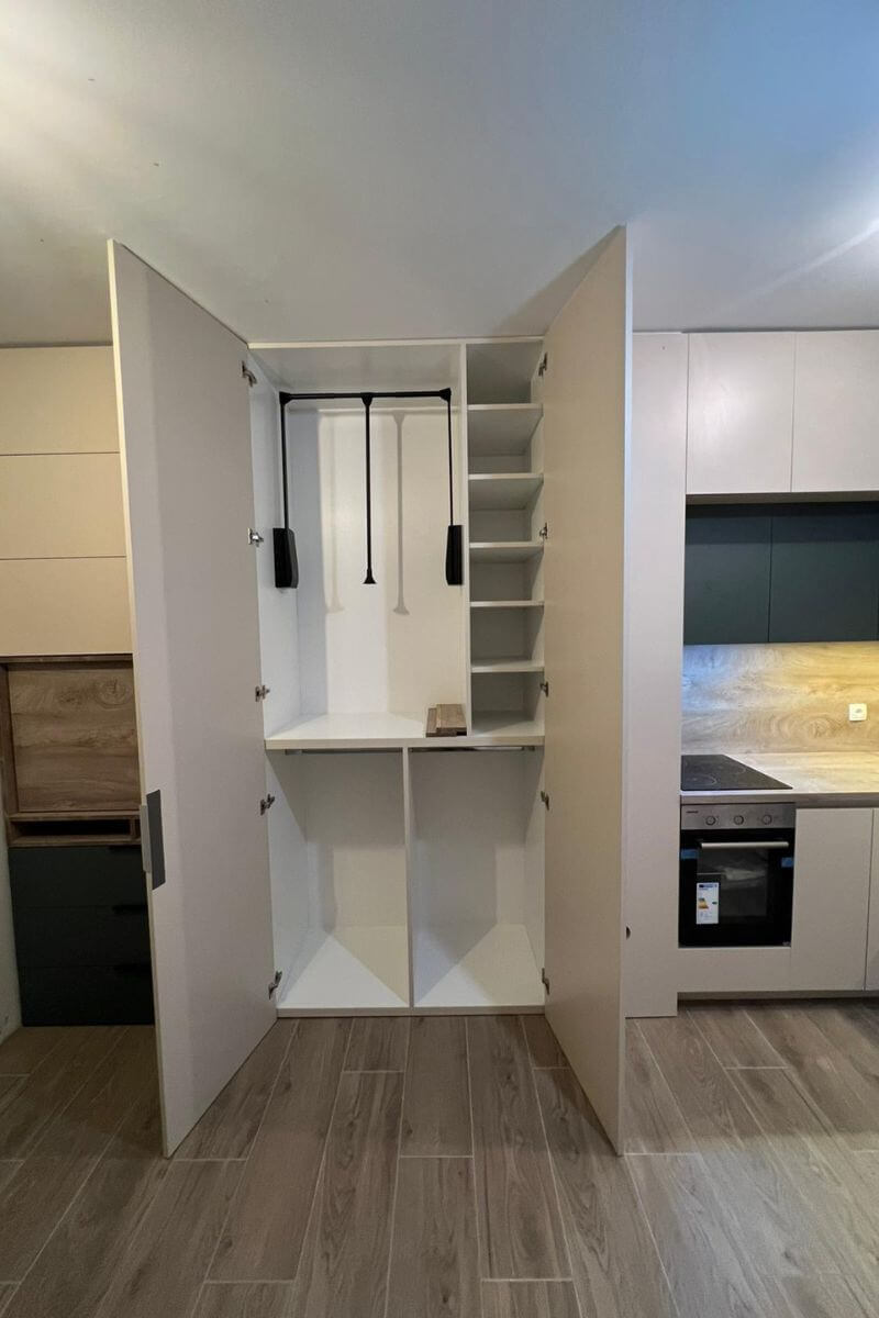Ova mala garsonijera od svega 24m2 bila je pravi izazov za naš Studio za dizajn interijera. Projektni zadatak je bio kompenzirati sobu koja nedostaje, iskoristiti maksimalno prostor, a opet ostaviti isti da maksimalno diše.