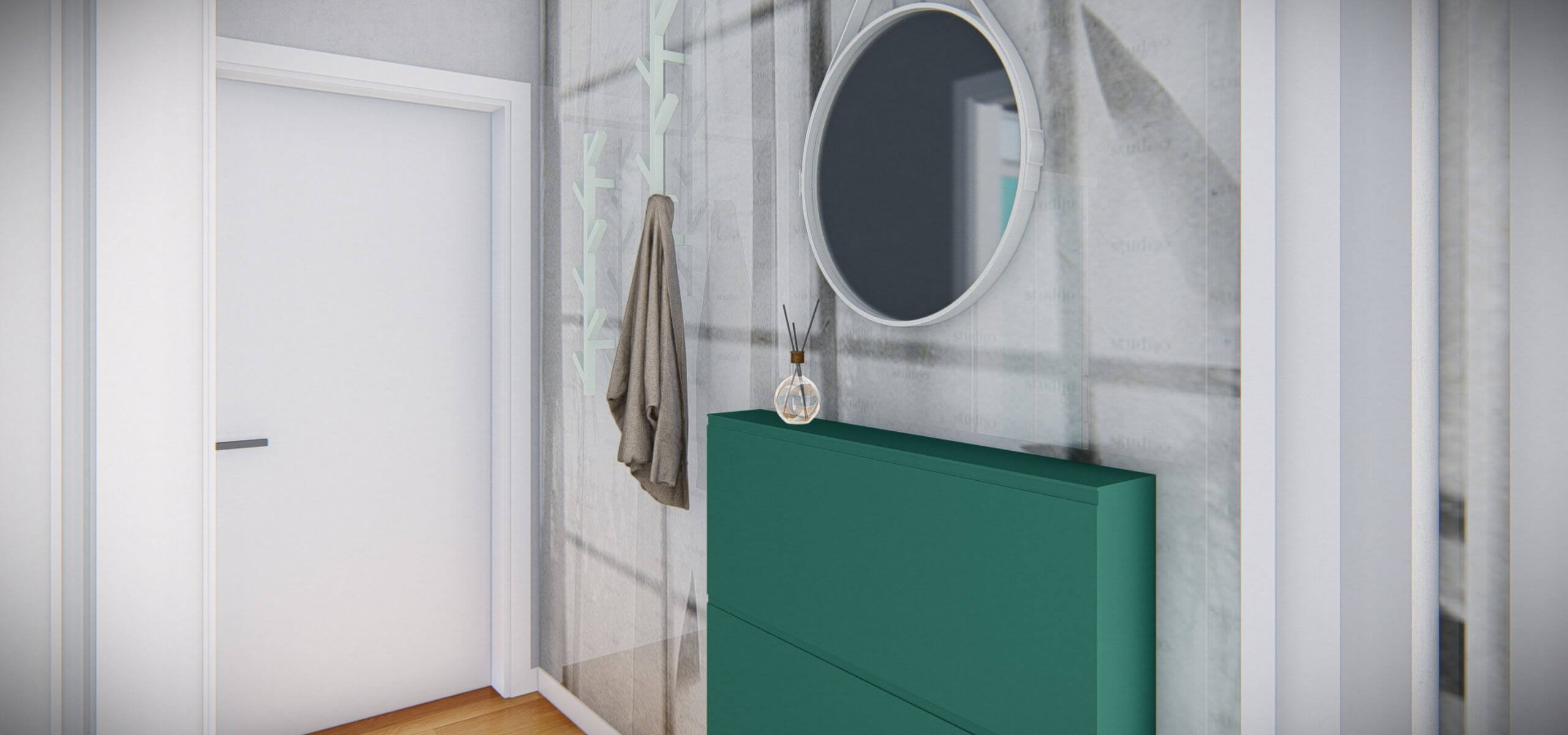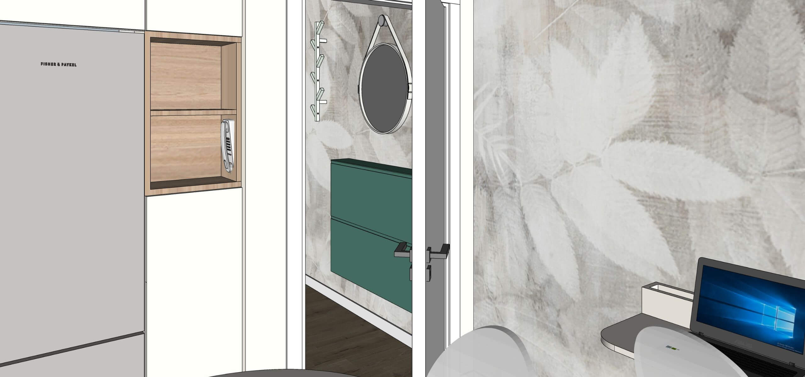 Svi ormari po mjeri rađeni su do stropa, a odabir boja i materijala išao je u smjeru vizualnog proširivanja garsonjere. Točka na i je svakako 3D tapeta i ogledalo koji daju dojam prozračnosti.