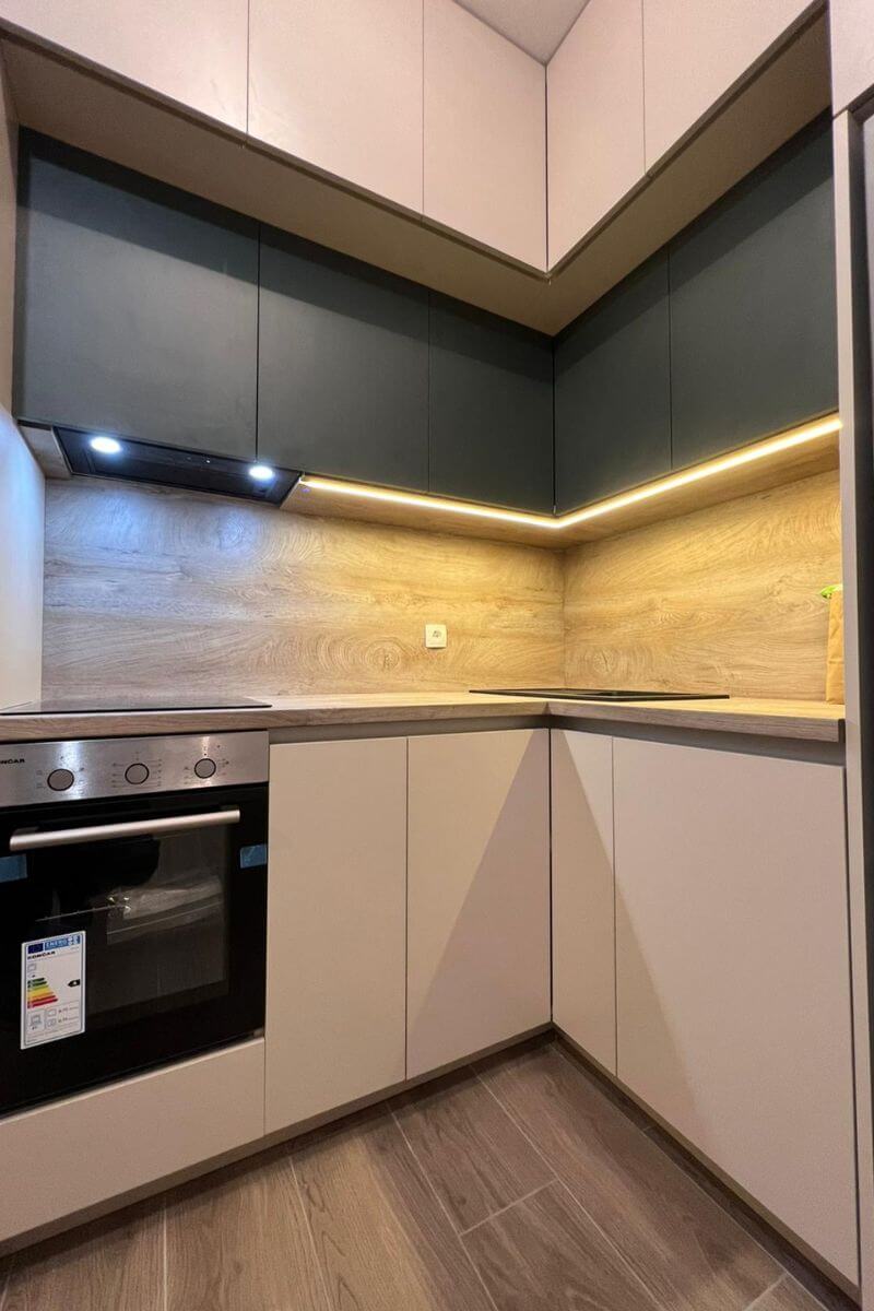 Kako bi maksimalno iskoristili kuhinjski prostor dodali smo ploču za kuhanje, pećnicu u perilicu za suđe u širini 45cm i time dobili sve potrebno u malom prostoru.